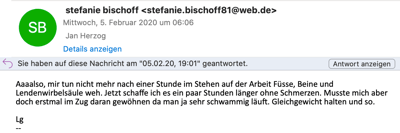 "Ein paar Stunden länger ohne Schmerzen." Stefanie Bischoff - Shop Weyhe mit Ihrer Erfahrung: kybun Schuhe im Zug.