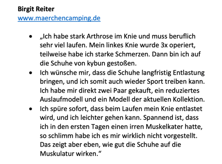 "Ich trage ungern noch andere Schuhe und alle meine anderen Schuhe stehen im Keller. Meine Knieschmerzen sind im kybun Schuh deutlich gelindert, der Grund für die Schmerzen ist u.a. Arthrose im Knie. Die kybun Schuhe gefallen mir nicht nur, sie gehören einfach zu meinem Leben dazu." Doris Müller (Ende 50er Lebensjahre)