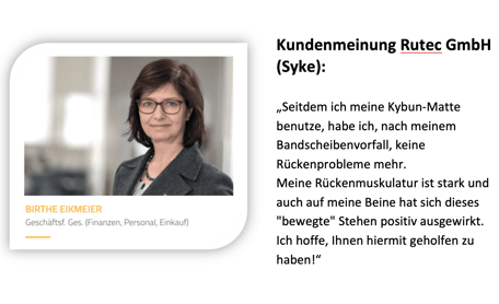 "Keine Rückenprobleme mehr." Frau Eikmeier aus Syke bei Weyhe über ihre Erfahrungen mit der kybun Matte im Büro.